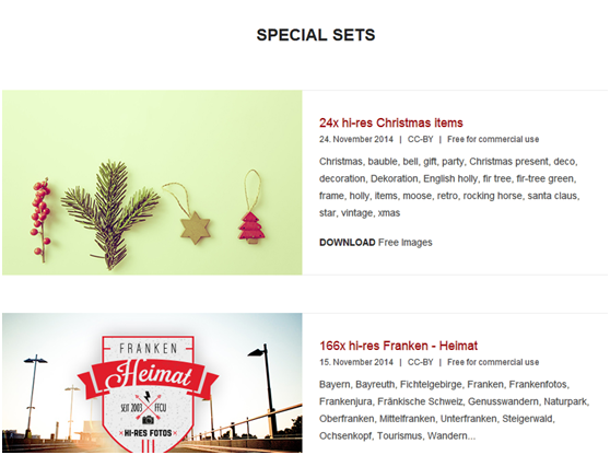 Raumrot提供较全的已分类照片,有食品饮料、自然、运动和工艺品,作品没有任何版权,用户可任意使用。