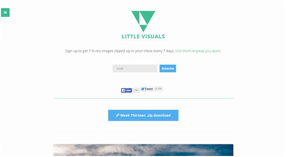 Little Visuals更人性化一些,只需提交你的Email,之后每星期就可以收到7张高像素的照片,也可以自行下载。题材多为风景作品,作品没有任何版权,用户可任意使用。