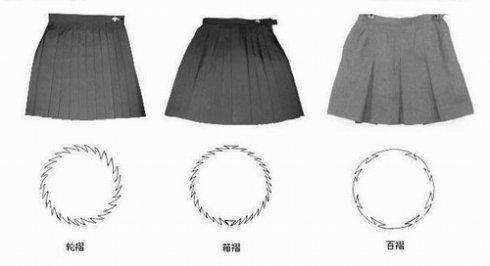 裙子的褶通常分为三种:轮褶、箱褶、百褶。轮褶是使用最多的普通形式,所有的褶都是同样的方向折,整体上呈顺时针方向转动,褶数可以有16、20、24、28、32,通常的是24褶数,材质多用轻飘飘有透明感的聚酯纤维混杂棉。箱褶的使用要低于轮褶,左右两边的褶是互相对称的。百褶的使用比以上两种要少很多,褶倾向于内侧,褶数也是各种各样,百褶裙能够衬托出着用者的身材。水手服变形,裙子也是很关键的地方,通常会在褶上下工夫,或取消褶,或者改变褶的形态。