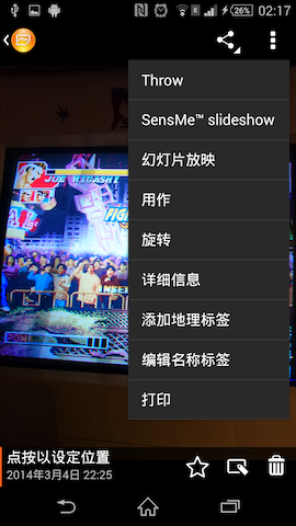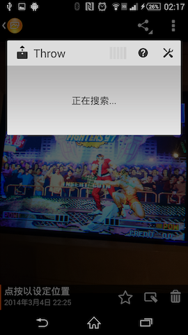 下图以 SONY Xperia Z2 及自带的 Album 程序为例,简述一下使用过程。打开一张图片后,点击菜单如图一即出现 Throw【注2】,点击 Throw 即出现搜索框,搜索网络中可用于传输的设备(此处包含 DLNA 和 WiFi Direct)。如果网络中支持 DLNA 的电视,即刻就会出现在搜索结果中,DLNA 是基于 UPnP 的,不需要双方做任何设置,就可以完成推送过程。