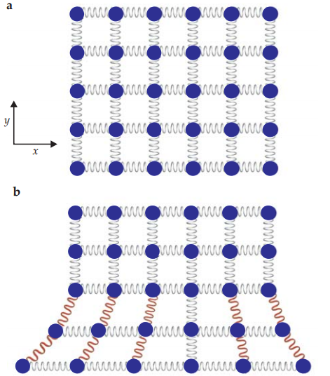 把塑料袋简化成上图的模型,并考虑最简单的情况。上图中的点表示质量点,点与点之间仅考虑弹性关系。a表示没有收到揉压时塑料袋平面的情况,b表示受到一处揉压快要形成一条褶皱的情况。b中下半部分的材料,其垂直方向受到较大的弹力,如果继续加力揉压,超过材料的弹性限度,其内部的弹力不足以抵抗外部的力量,材料便会断裂或者形变(对于塑料袋,由于有较好的延展性,则是产生折痕)。在折痕产生的同一时间,由于材料内部已经积蓄了一定的弹性势能,折痕产生之后,材料内部的弹性势能以热和声音的形式释放出来,便有我们听到的噪声[2]。