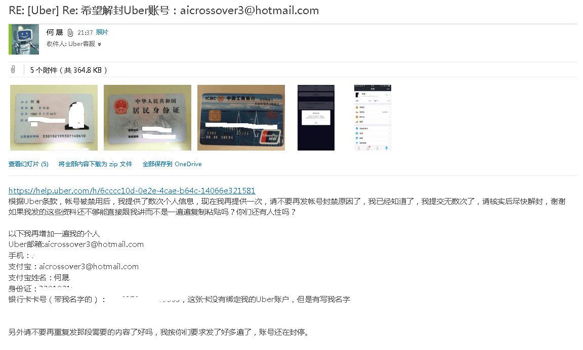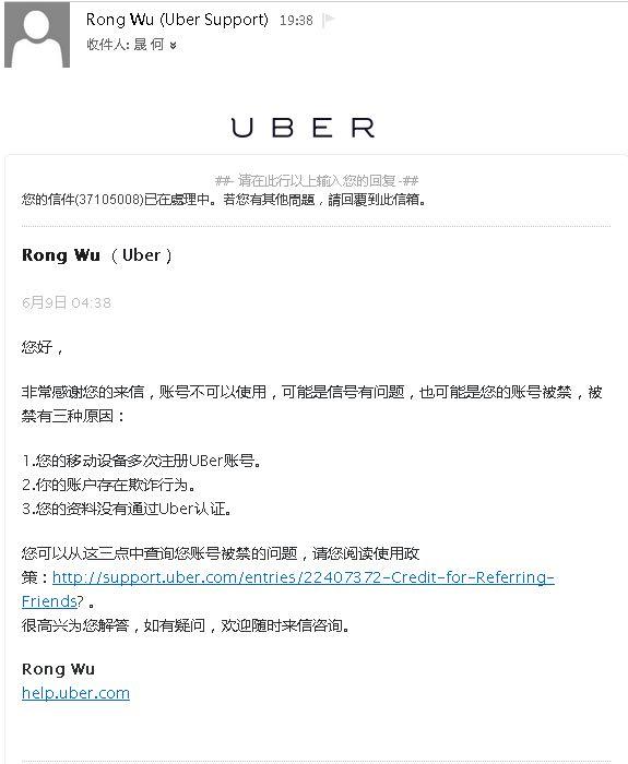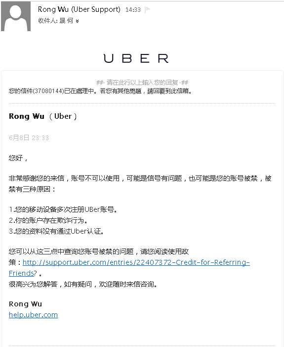 Uber在我多次提交身份信息后依然给出相同的机械式的毫无意义的回答,要我看条款,OK我看了,也提供个人资料+信用卡+支付宝截图了,还是一样的回复,真是毫无用户体验。