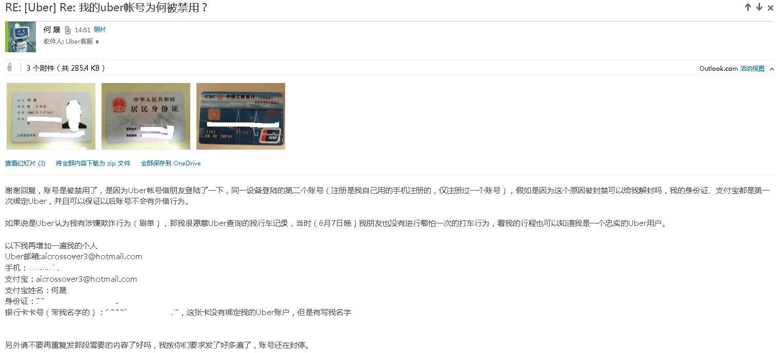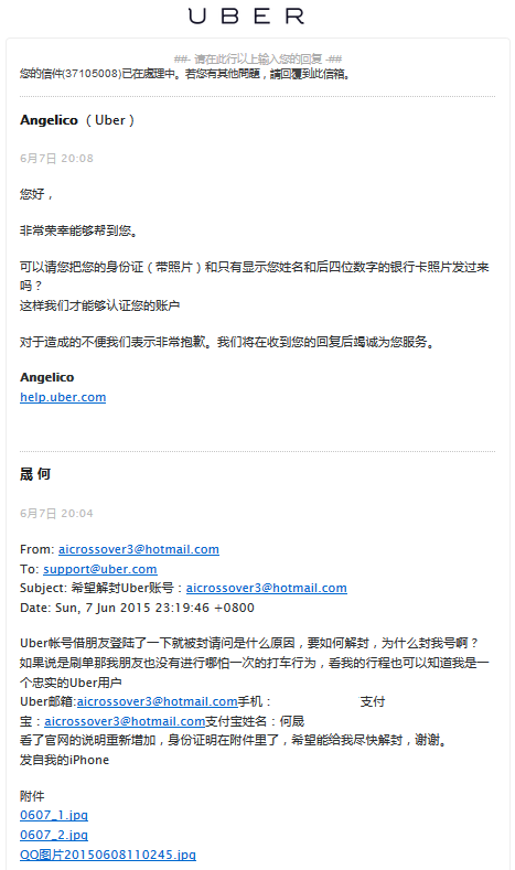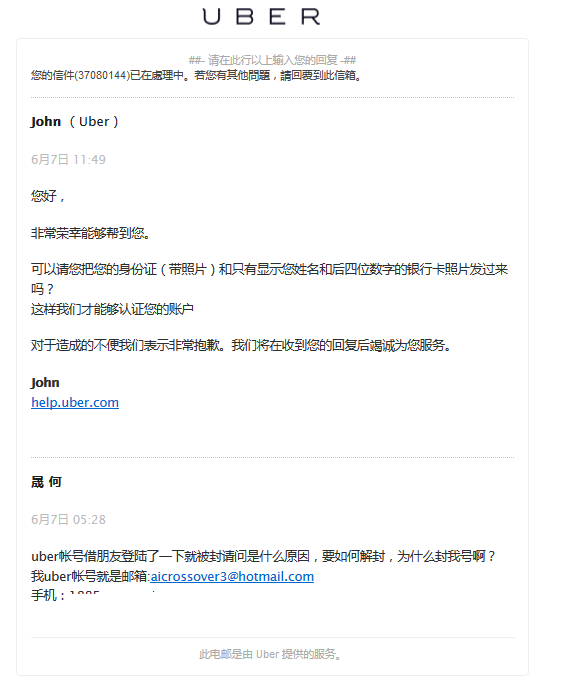 Uber客服John在半夜2点回复了我的邮件,要我提供身份信息,OK我提供发过去就是了,毕竟我生活离不开Uber。