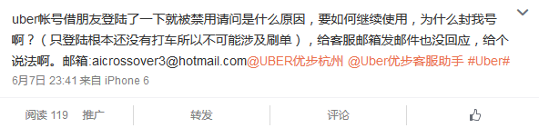 事情的经过是这样的:昨天晚上(6月7日)19点,我把Uber账户借给朋友下单打车,20点我上去就发现账户被禁用。问朋友说是登陆上去试图打车就被禁用了(并没有产生任何打车行为)。