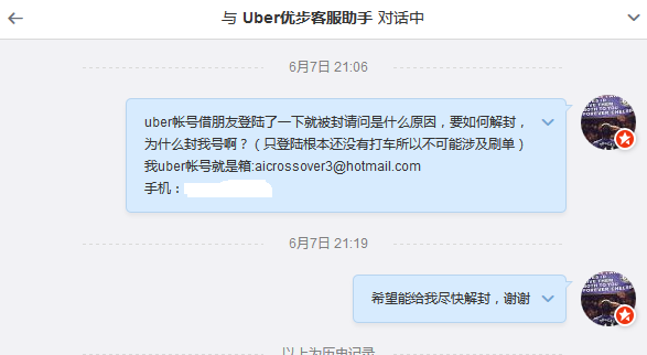 在投诉到工商和媒体双重平台后,御驾(上海)网络信息技术服务有限公司(以下简称Uber),终于打电话过来,表示系误封并且道歉,给予解封操作。我接受道歉,但不知道还会不会再用Uber。