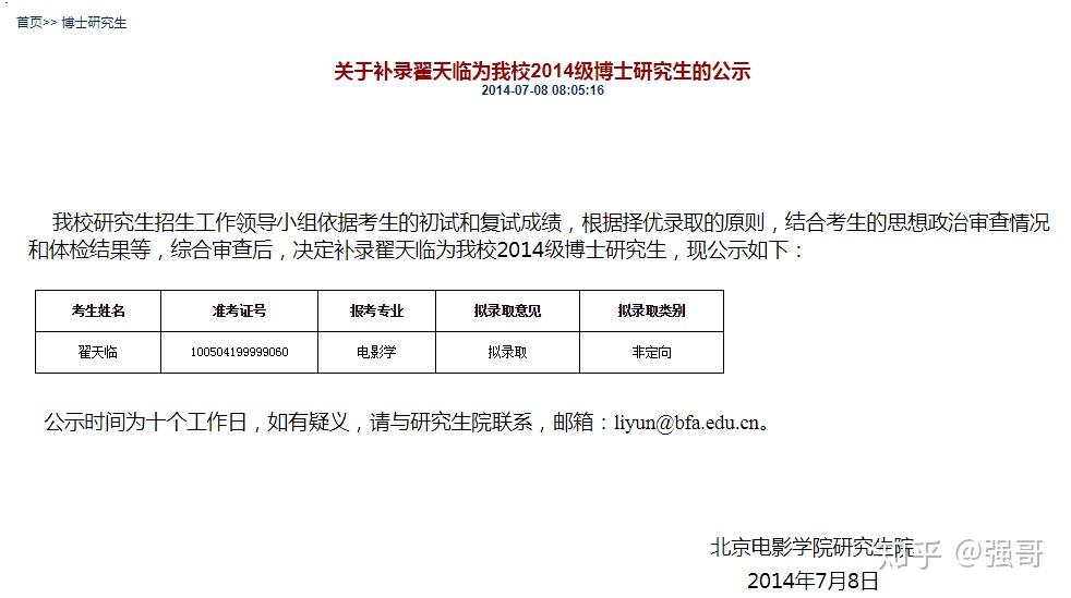 我们再看看翟天临博士录取竟然是补录的http://www.bfa.edu.cn/yx/yjsb/2014-07/08/content_75309.htm