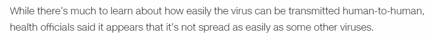 1月26号,美国疾控中心表示:“新冠病毒并不像其他病毒一样容易传播。”