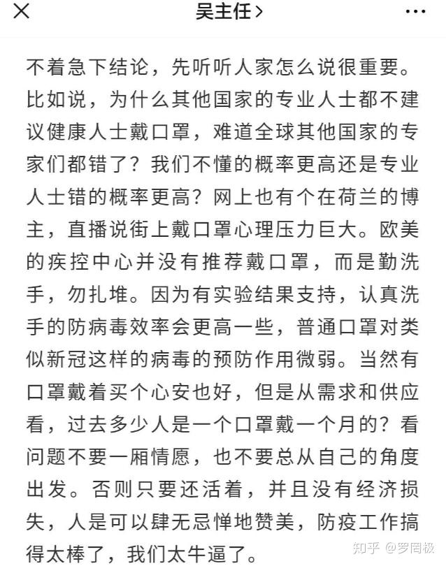不着急下结论,先听听人家怎么说很重要。比如说,为什么其他国家的专业人士都不建议健康人士戴口罩,难道全球其他国家的专家们都错了?我们不懂的概率更高还是专业人士错的概率更高?网上也有个在荷兰的博主,直播说街上戴口罩心理压力巨大。欧美的疾控中心并没有推荐戴口罩,而是勤洗手,勿扎堆。因为有实验结果支持,认真洗手的防病毒效率会更高一些,普通口罩对类似新冠这样的病毒的预防作用微弱。当然有口罩戴着买个心安也好,但是从需求和供应看,过去多少人是一个口罩戴一个月的?看问题不要一厢情愿,也不要总从自己的角度出发。否则只要还活着,并且没有经济损失,人是可以肆无忌惮地赞美,防疫工作搞得太棒了,我们太牛逼了
