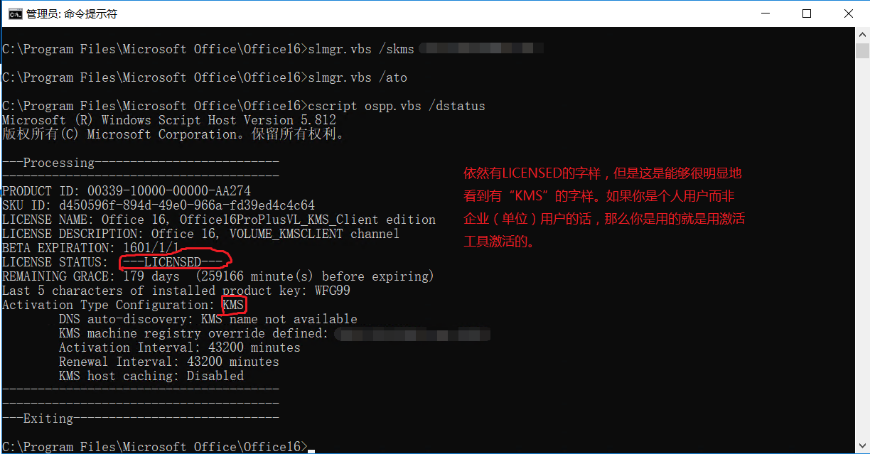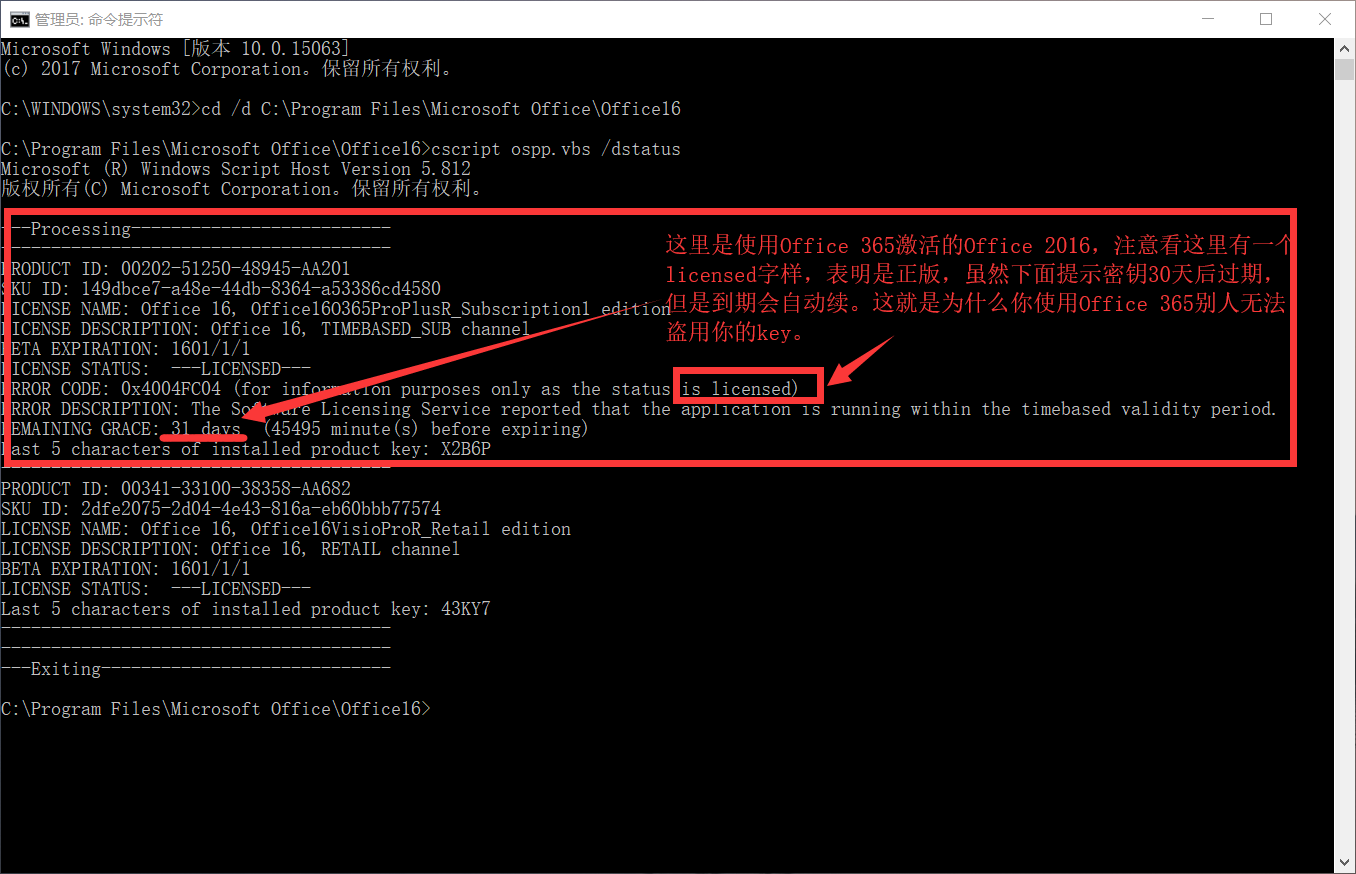 值得注意的是,如果你是使用KMS激活的,那么在“文件—账户“中的显示与上面二者无异,但是在命令提示符中查看许可证,即可看出端倪: