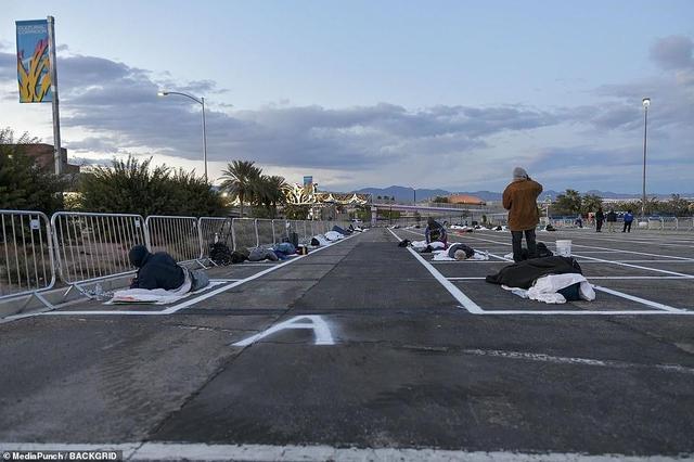 照片中是一个露天停车场,停车场上的车位中铺着许多被褥,很多流浪者躺在被褥里。为了达到疫情期间的距离要求,他们还间隔着车位躺,除了被褥和自己的衣服,再也没有什么取暖设备、也没有任何其他的防护措施。而所谓的被褥,也只是一层单薄的白布,根本没有任何御寒能力。