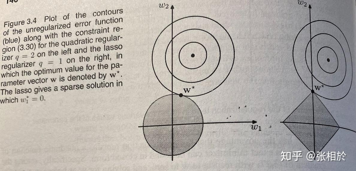 先说为什么这个理解不对。这个理解最显著的问题之一在于:参数w1和w2都只有一个唯一的最优值,因此不存在“红圈上一个点和蓝圈上一个点之和”这样的说法,而是在整个二维平面中只存在一个最优的w1和w2,只是这组解需要满足多个条件而已。此外单纯从从相切点的唯一性来判断结果是否极值也存在不严谨之处,毕竟loss等高线和正方形(或图a的圆形)可以相切的地方不止这一个,而且即使承认这里是极值点也无法判定这里是极大值点还是极小值点,所以并不能很好地解释原问题。
