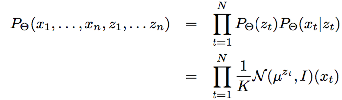 在第二层境界的基础上, 你就能随意傲游EM算法用到GMM和HMM模型中去了。 尤其是对GMM的深入理解之后, 对于有隐变量的联合概率,如果利用高斯分布代入之后: