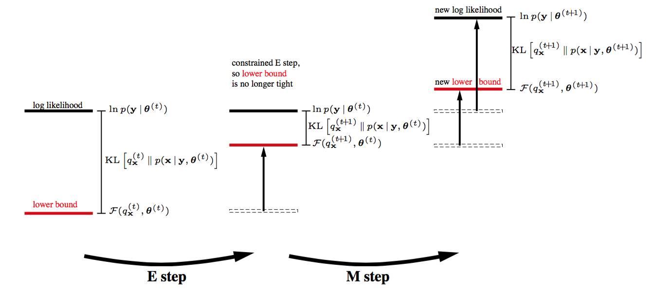 所以,先固定当前参数, 计算得到当前隐变量分布的一个下届函数, 然后优化这个函数, 得到新的参数, 然后循环继续。