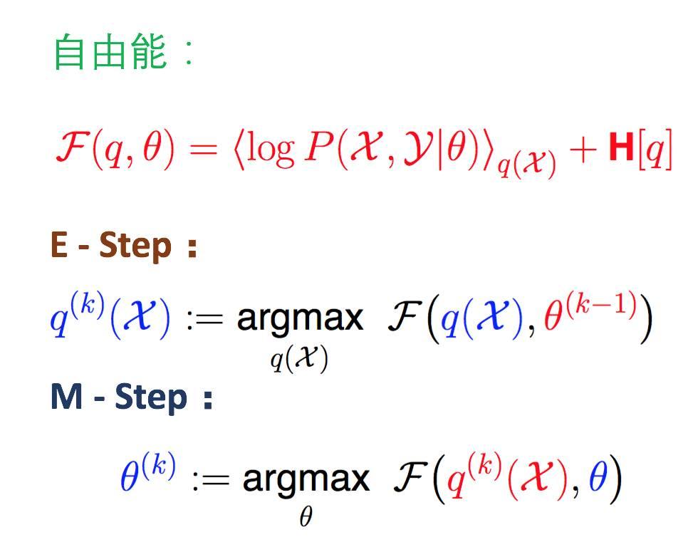 这样我们把Jensen不等收右边的部分定义为自由能(如果你对自由能有兴趣,请参考“给能量以自由吧!”,如果没有兴趣, 你就视为一种命名)。 那么E步骤是固定参数优化隐分布, M步骤是固定隐分布优化参数,这就是广义EM算法了。