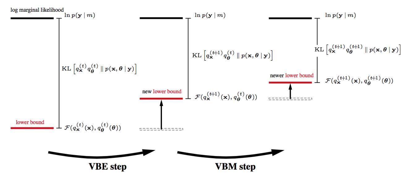 这里我们讨论Hinton和统计大神Jordan的强强发力的领域。当Bayes网络发展到高级阶段, 概率图模型使得计算成为问题,由此开启了Variational Bayes领域。在“变の贝叶斯”里面, 我们解释了研究Variational Bayes,有3拨人。 第一拨人, 把物理的能量搬到了机器学习(参考 “给能力以自由吧!”)。 第二拨人, 就是Hinton,他将VB和EM算法联系了起来,奠定了现在我们看到的VB的基础。 第三拨人,就是Jordan, 他重建了VB的框架ELBO的基础。所以说EM算法扩展的VBEM算法,就是Hinton和Jordan共同发力的部分。
