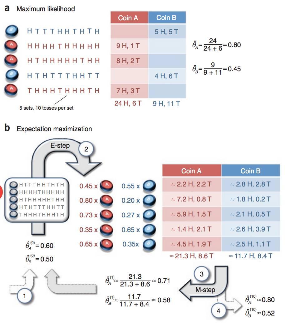 这个例子为什么经典, 因为它告诉我们,当存在隐变量I的时候, 直接的最大似然估计无法直接搞定。 什么是隐变量?为什么要引入隐变量? 对隐变量的理解是理解EM算法的第一要义!Chuong B Do & Serafim Batzoglou的Tutorial论文“What is the expectation maximization algorithm?”对此有详细的例子进行分析。