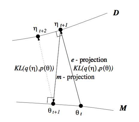 无论f-散度还是bregman散度对正反KL距离的统一, 之后的广义EM算法, 都会变得空间的最优投影的交替出现。 或许广义EM算法也成了不同流形空间上的坐标梯度下降算法而已coodinate descent。