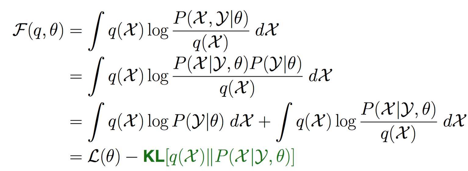 有了广义EM算法之后, 我们对自由能深入挖掘, 发现自由能和似然度和KL距离之间的关系: