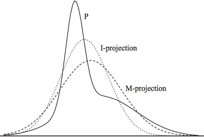 其实,前面基于KL距离的认知, 严格放到信息理论的领域, 对于前面E投影和M投影都有严格的定义。 M投影的名称是类似的,但是具体是moment projection,但是E投影应该叫I投影,具体是information projection。