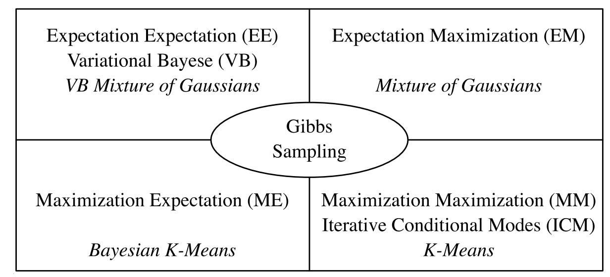 VAE的发明者,Hinton的博士后, Max Welling在论文“Bayesian K-Means as a “Maximization-Expectation” Algorithm”中, 对这种关系有如下很好的总结!