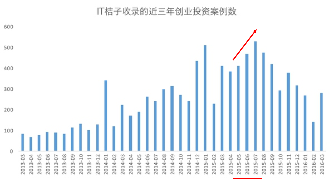 反常的原因是什么呢?我们抓取了IT桔子上近3年来融资事件的数量变化。可以发现出现招聘需求异常的5到7月是创业融资案例数迅速攀升的时候,7月份融资案例数达到顶峰。