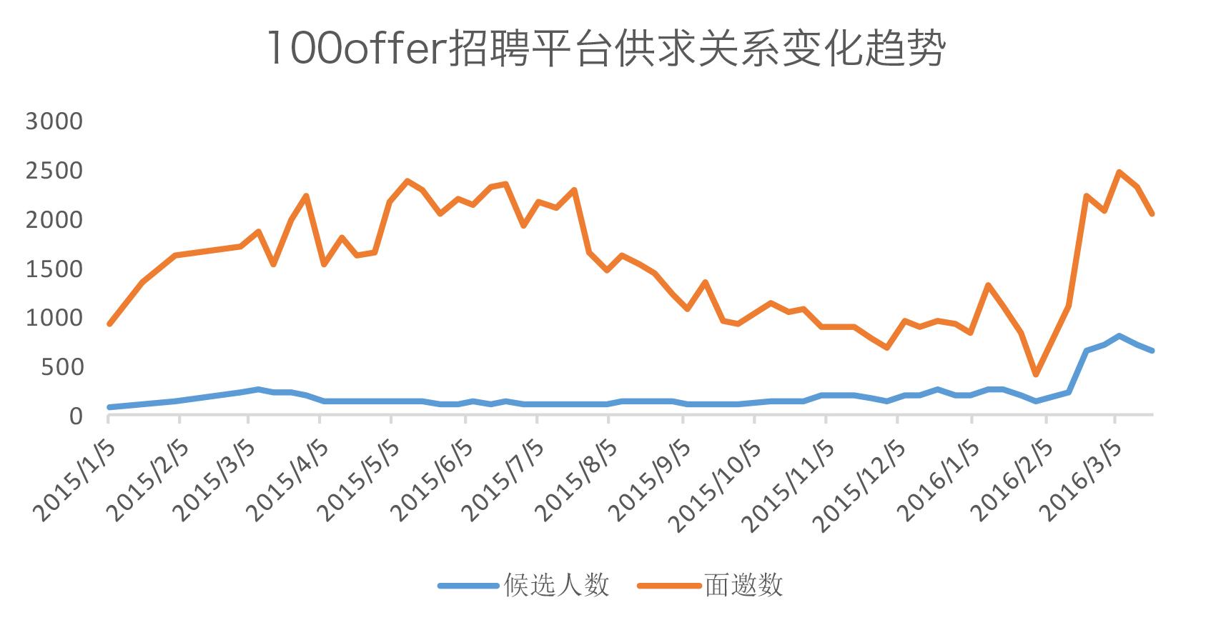 这是100offer上每月候选人数和面邀数的绝对值。请关注一下橙色线条的情况。
