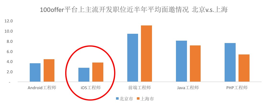 对于iOS而言,北京市场失衡更为严重。下图是100offer平台上雇主最集中的城市北京、上海两地候选人拿到面试邀请的情况,北京的iOS工程师拿到的面邀数比上海还要低。