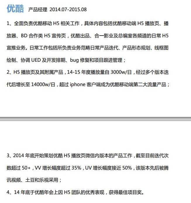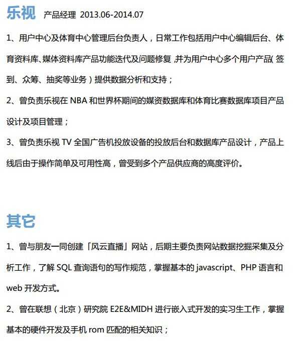 - 按照简历中的说法,其曾为金山WPS PC端负责人,负责过WPC Mail、小米邮件,乐视用户中心、体育中心后台负责人,优酷移动H5负责人,创建风云直播……以及「了解SQL查询语句的写作规范」。(简历截图见文后)