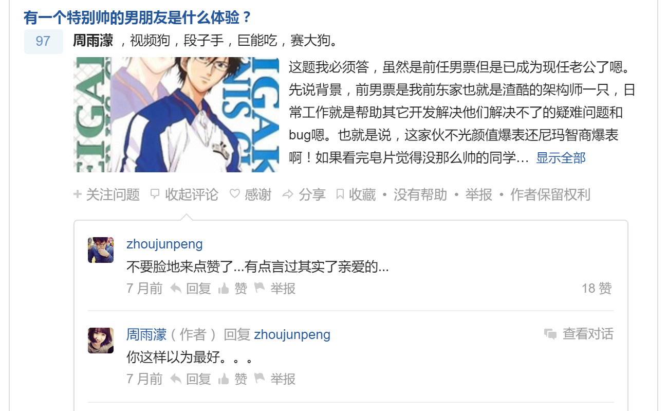 - 其在2015-08-02日回答知乎的你,想在这里找到女朋友吗? - 周雨濛的回答中写到「希望找到另一半」,在2015-10-25日回答有一个特别帅的男朋友是什么体验? - 周雨濛的回答中写到「已成为现任老公」。两个半月闪婚?