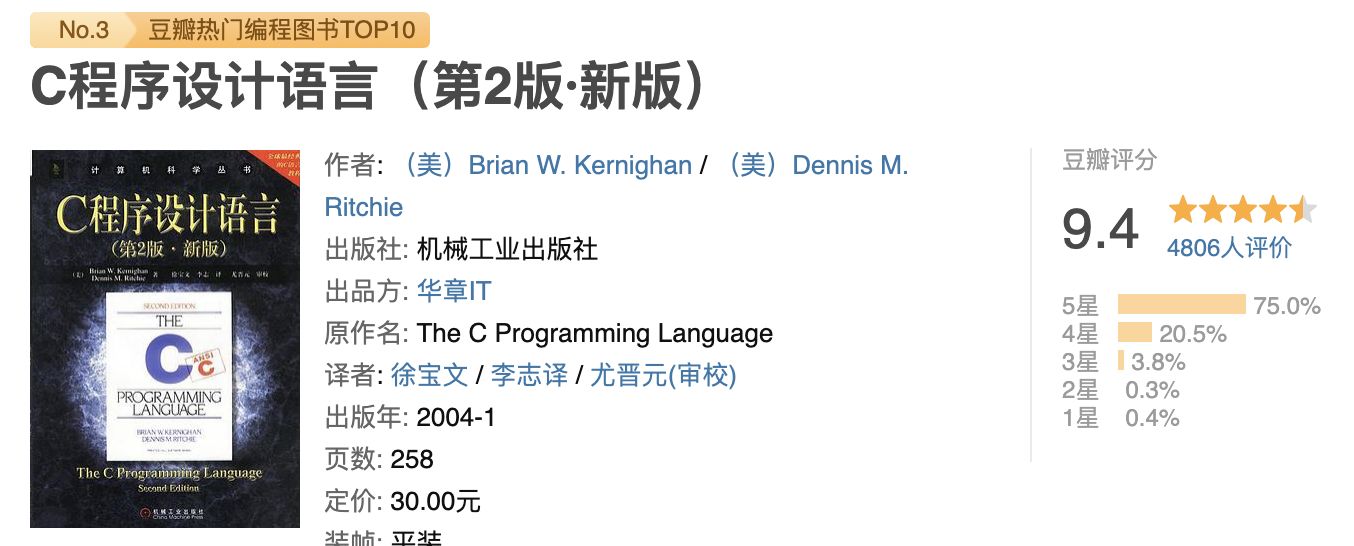这本书的作者是 C语言之父,所以全书讲的都是 C语言的核心。代码示例大多都是库函数的实现方法,内容简洁明了,干净利落,没有废话。不太适合小白。