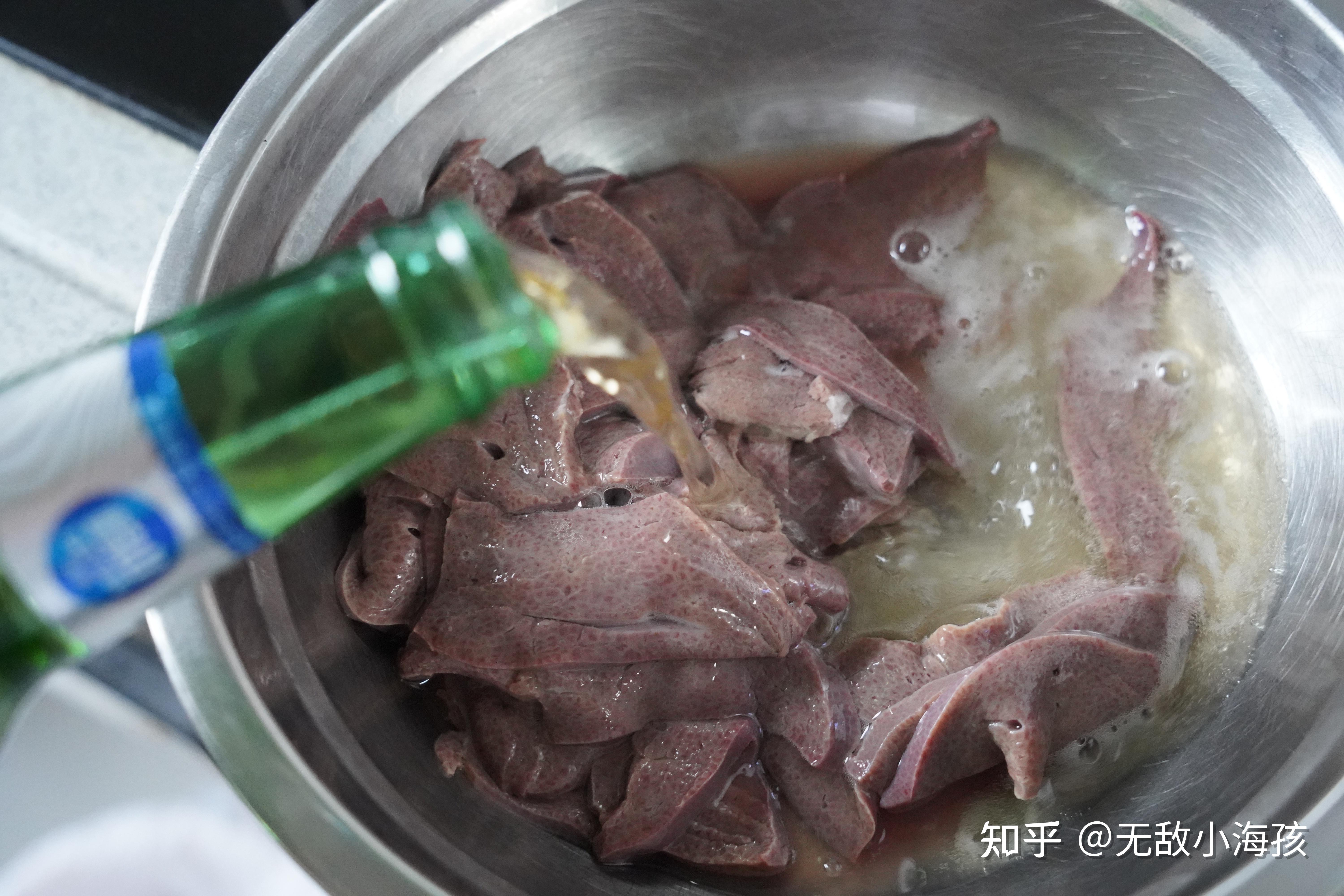 TIPS2:泡好的猪肝,最后用啤酒再抓一抓,很神奇的是,用啤酒抓过的猪肝就特别嫩,而且一点异味都没有。