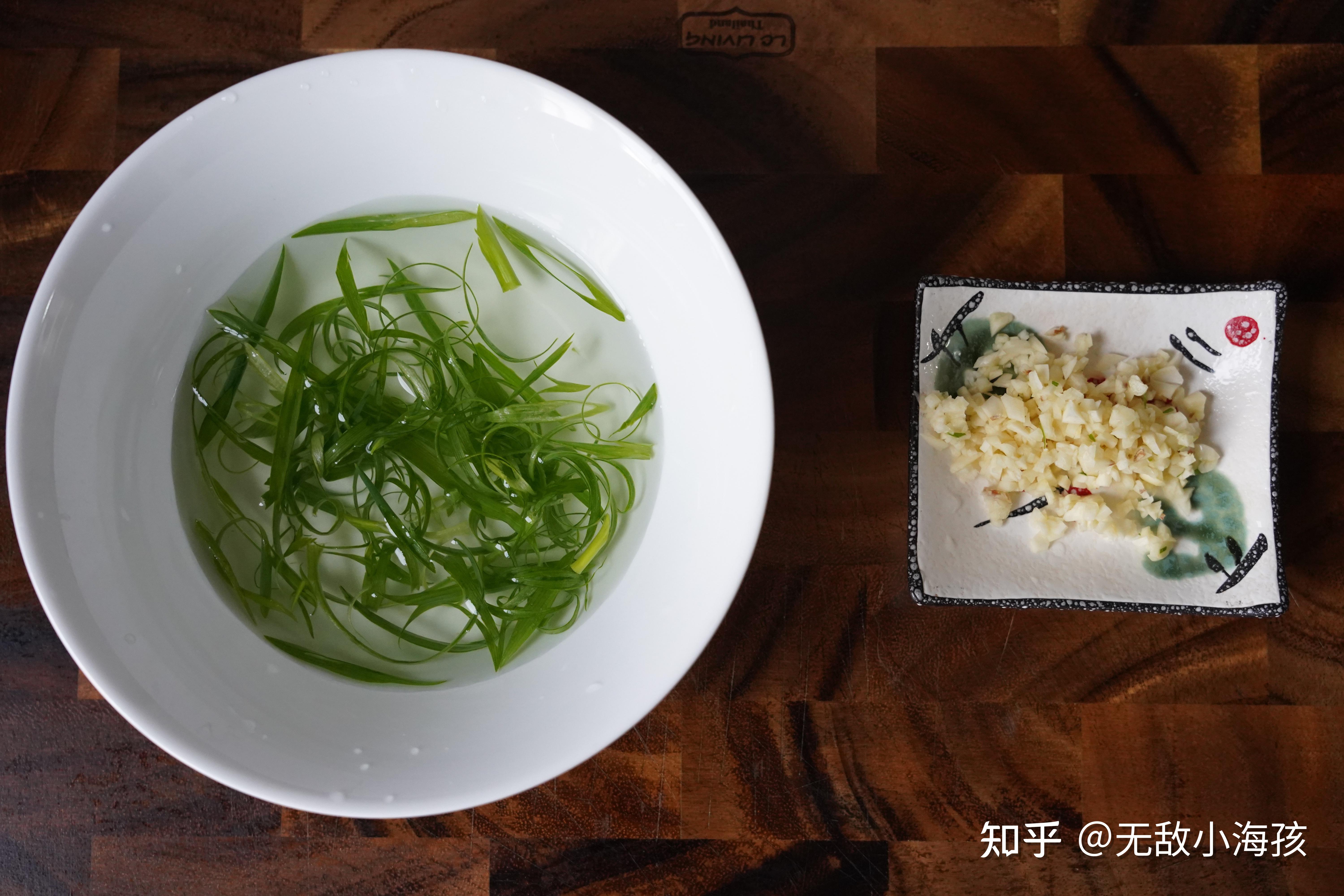 最后,就是淋油了,切好的葱丝和蒜末,摆在食材上。