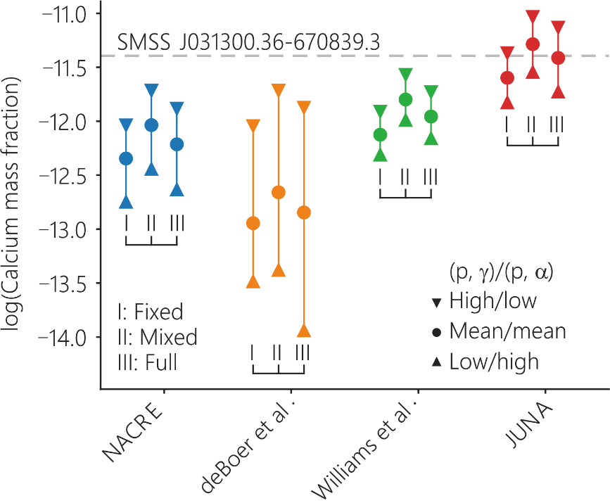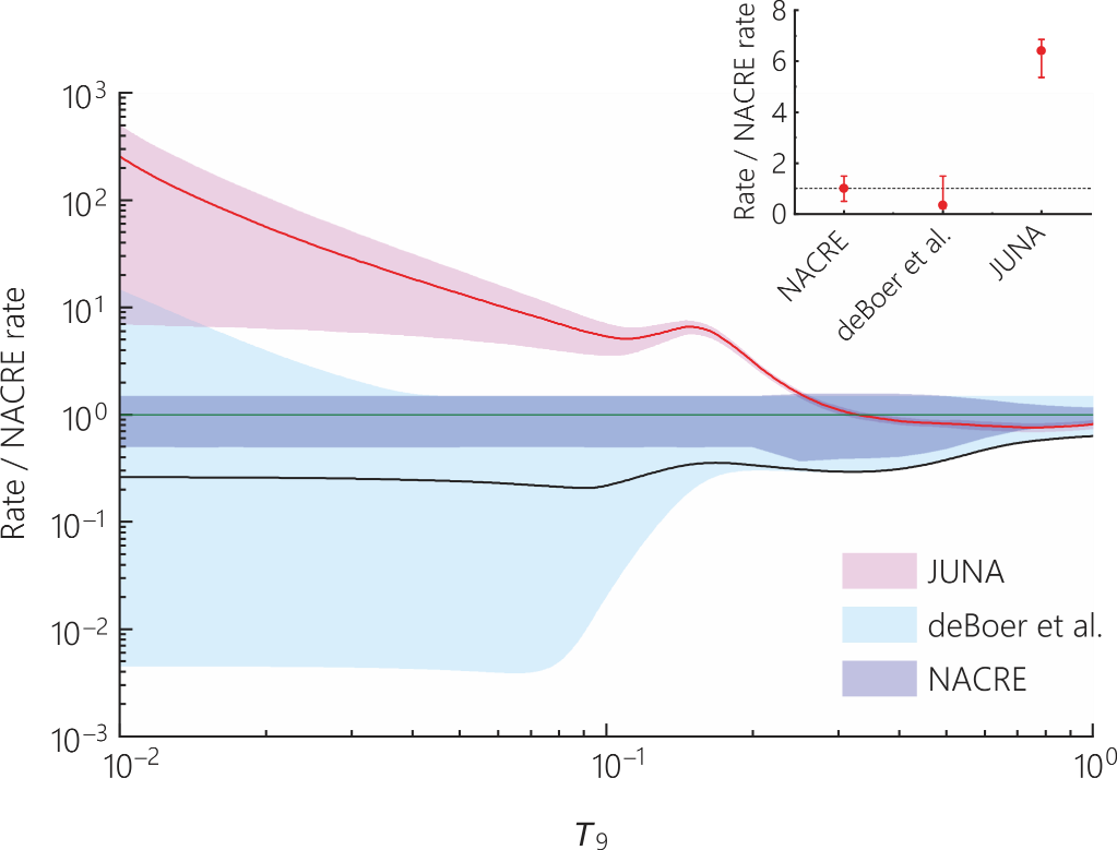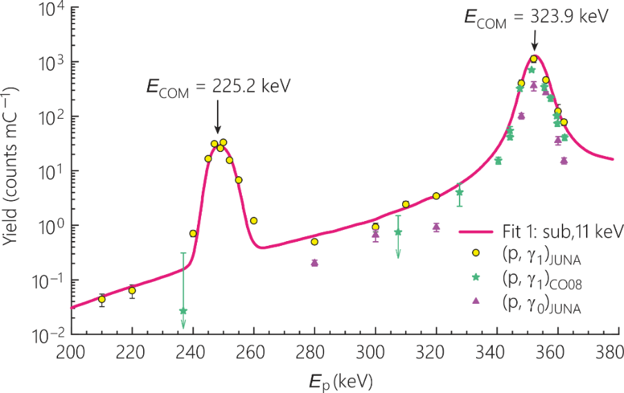 2021年初,利用锦屏加速器提供的强流质子束成功将该突破反应从之前的240 keV一直向下推进至186 keV能量点,触碰到了第一代星感兴趣的伽莫夫能区,并幸运地在225 keV处发现了一个新的共振。在第一代星最感兴趣的0.1 GK温度附近,此新共振的发现使得的突破反应的反应率比之前NACRE数据库中的推荐值大了5.4~7.4倍;将之前0.1 GK温度附近的反应率不确定度从几个数量级缩小至50%左右,极大地降低了该反应率在天体网络计算中所引入的误差。同时,与天体物理学家合作,研究了该反应率在第一代星中的影响,计算表明突破反应从‘温’碳氮氧循环循环突破出去的概率比之前预想的要大7倍左右,解释了SMSS0313-6708中观测到的钙丰度问题。另外,强有力地支持了Pop III星的弱超新星爆模型,排除了其他天体模型的可能性。值得一提的是,近期发射升空的詹姆斯·韦布太空望远镜JWST的关键科学目标之一即是对宇宙中最古老的第一代星和星系的探测,目前已经观测到一批古老的恒星群。因此,本工作为研究JWST未来的观测结果提供了可靠的核物理输入量。