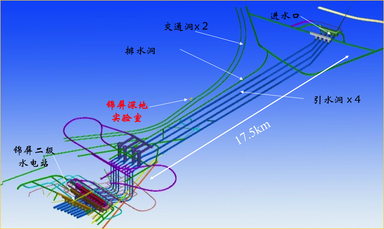 也是机缘巧合,十多年前,水利学家在四川雅砻江边的锦屏山深处发现了一个非常适合建造水电站的地方,他们在2400米深处修了一个引水池,建造了雅砻江流域水电站。科学家们发现了这么一个绝佳的深地实验环境,如获至宝。因为2400米深处的岩石就像一个暗室,能够牢牢地把宇宙射线的噪声给屏蔽掉。于是,国家支持科学家们在雅砻江水电站旁边开凿了一个巨大的空间,建造了一个世界上最深、最安静的实验环境。