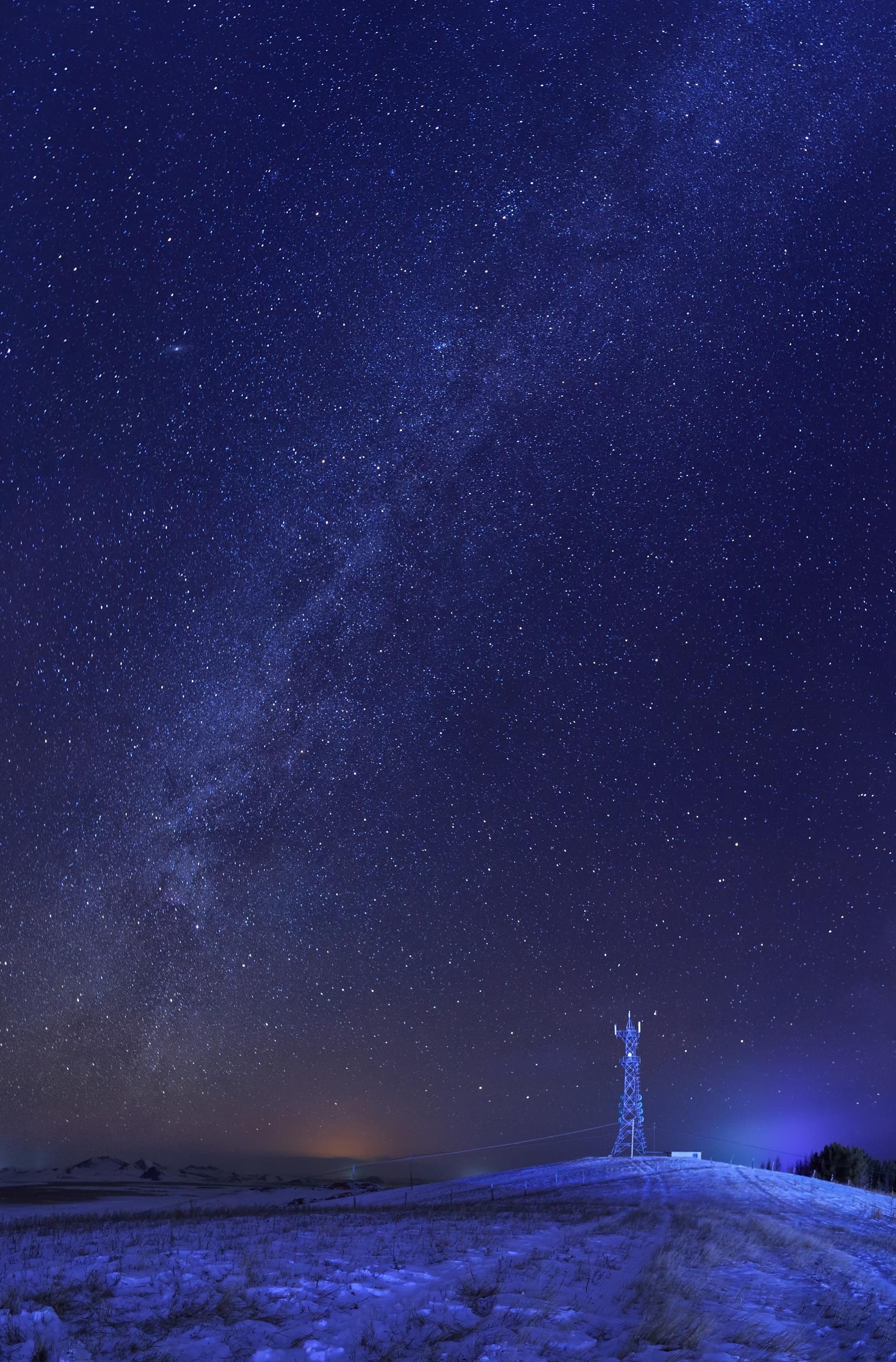 内蒙古的冬季,温度越低噪点也会相应少一些,但是冬季的银河比较暗淡,4张横幅拼接。
