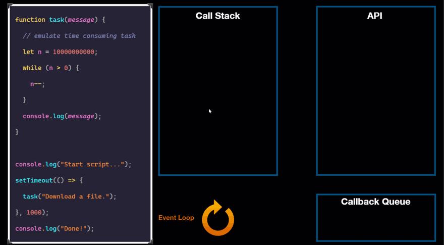 event loop在将task()从回调队列中移出的时候,首先问一下调用栈是否为空,如果不是event loop 会一直等到它为空,然而,如果为空,它会将task()移动到调用栈中。