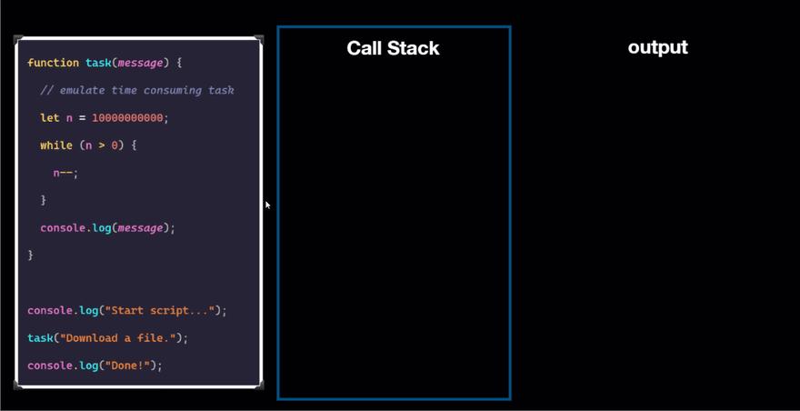 然而,它(JavaScript引擎)花费一段时间将take()执行完成,因此,你将会在一段时间之后看见信息Download a file ,当take()执行完成后,JavaScript引擎将它弹出调用栈。