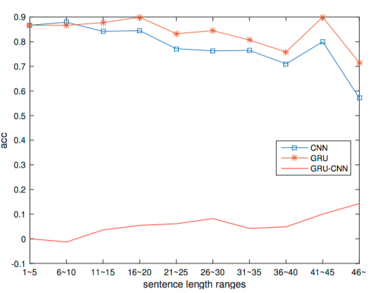 结论是:当句子的情感分类是由整个句子决定的时候,GRU会更容易分类正确, 当句子的情感分类是由几个局部的key-phrases决定的时候,CNN会更容易分类正确。