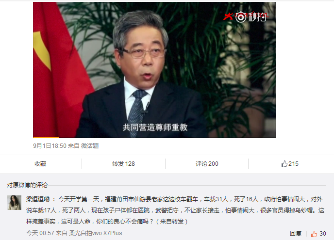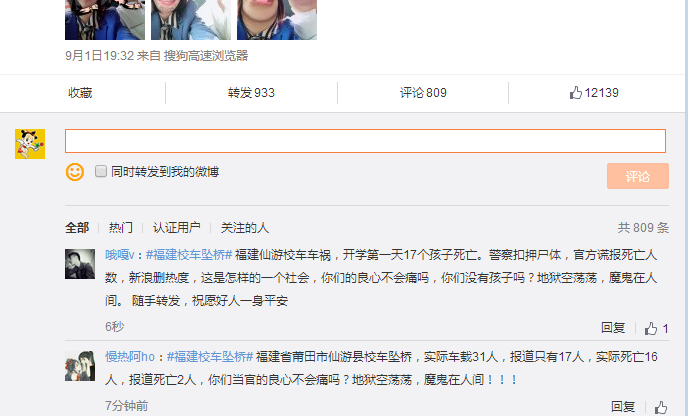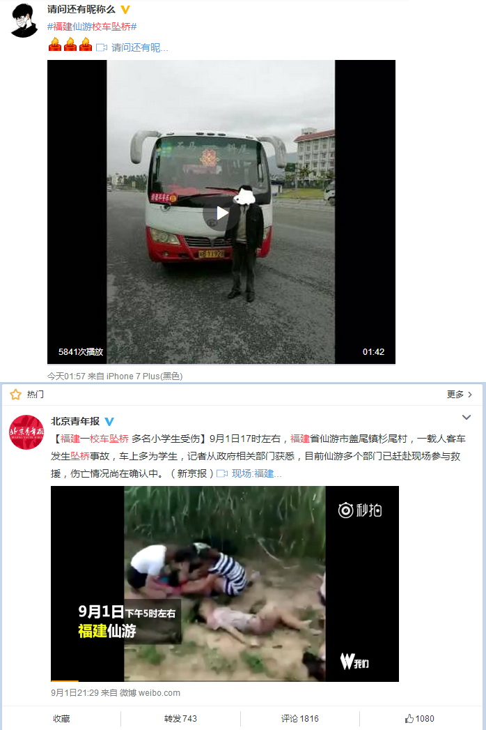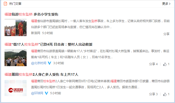 四、网友报复性转发。在教育部长讲话,排名第一的马天宇自拍、都有网友报复性的转发校车坠桥事故消息。