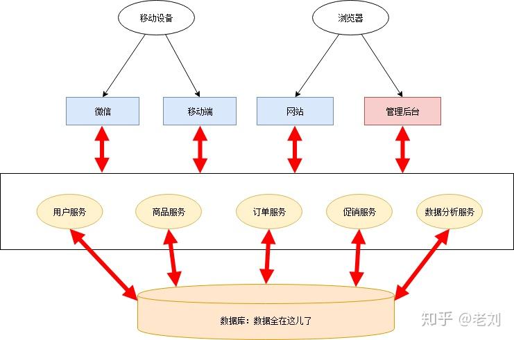 各个应用后台只需从这些服务获取所需的数据,从而删去了大量冗余的代码,就剩个轻薄的控制层和前端。这一阶段的架构如下: