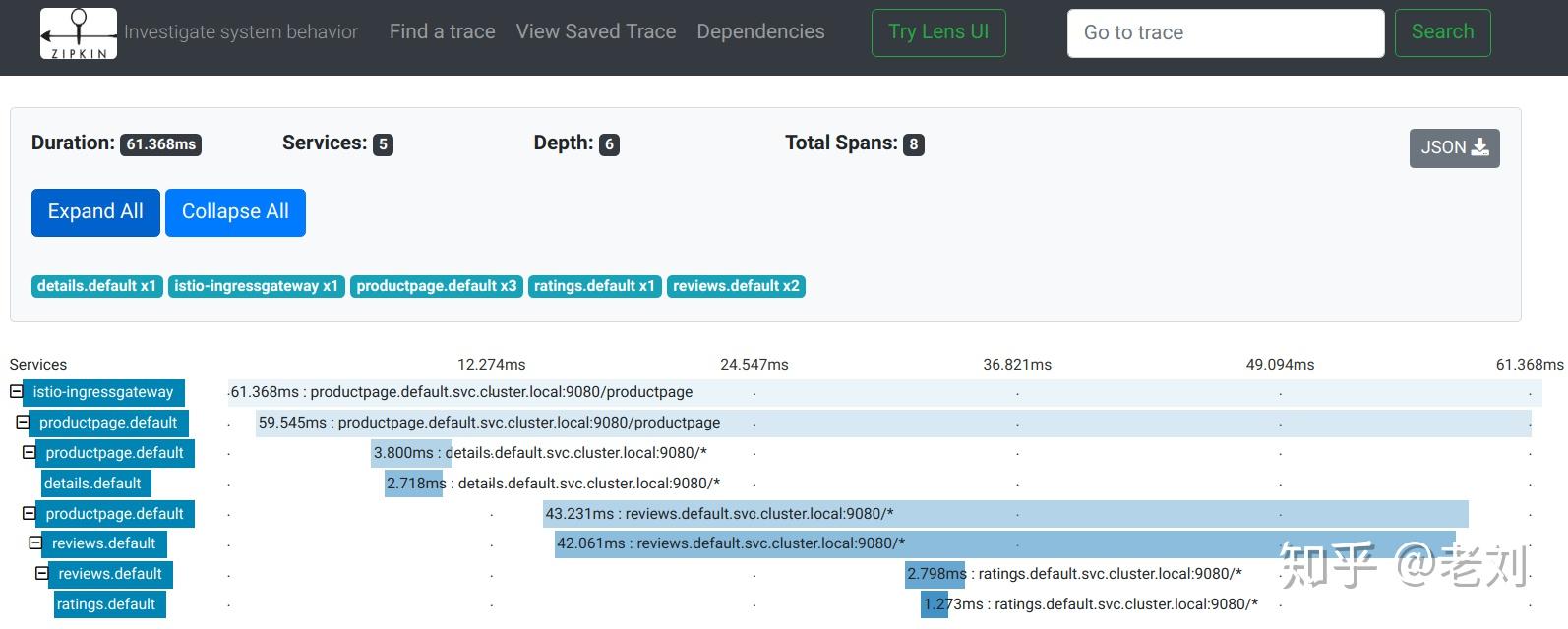 我们用一个Istio文档里的链路跟踪例子来看看效果: