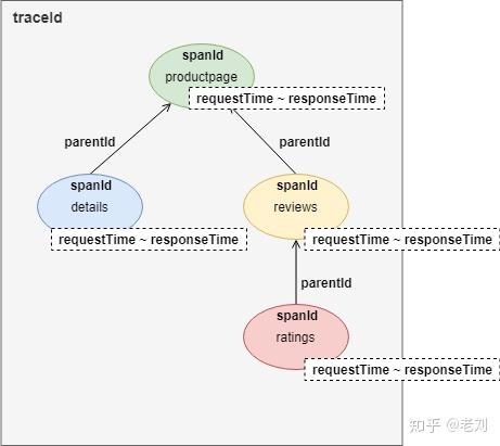 从图中可以看到,这是一个用户访问productpage页面的请求。在请求过程中,productpage服务顺序调用了details和reviews服务的接口。而reviews服务在响应过程中又调用了ratings的接口。整个链路跟踪的记录是一棵树: