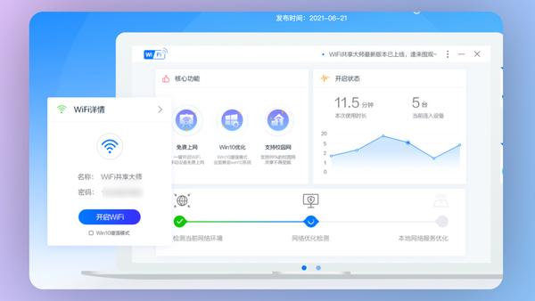 WiFi共享大师是一款免费的WiFi共享热点软件,支持多种平台,并能破解校园网客户端的多网卡限制,让用户能够轻松实现WiFi共享。通过创建安全可靠的WiFi热点,用户可以方便地共享网络连接,满足不同场景下用户的上网需求。